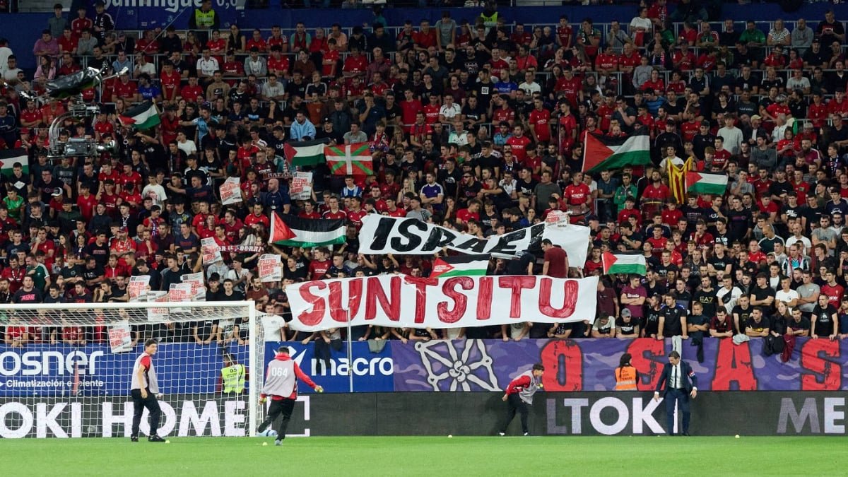 Crainicul stadionului a avertizat publicul prin sistemul de sonorizare. Pe lângă bannerul anti-Israel, suporterii au afișat și steaguri palestiniene.