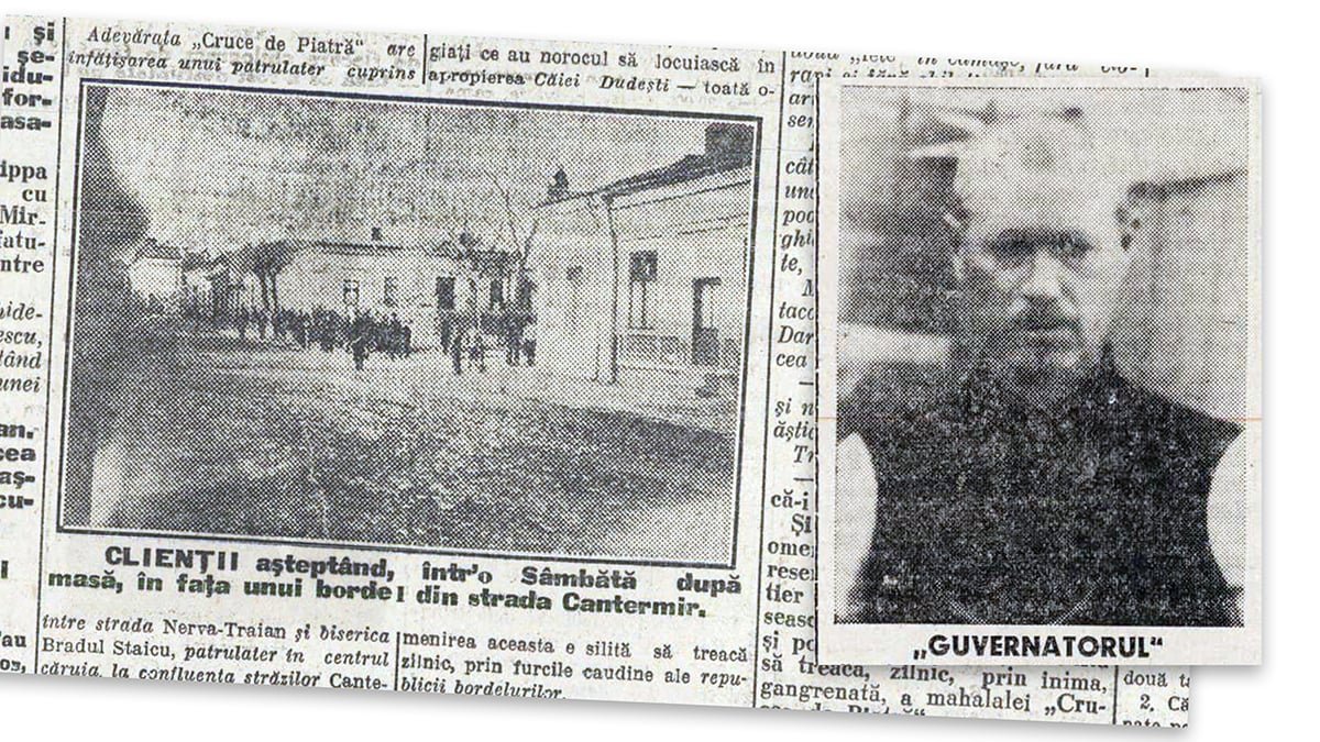 „Crucea de Piatră, strada şi sediul principal al bordeielor se întinde, ca o caracatiţă fetidă, pe străzile Nerva Traiani, Cantemir până în Câmpoduci. Sunt case mizere şi dărăpănate, cele mai multe, unele din paiantă, fără etaj (afară de «Cassanova»” palace-ul din Crucea de Piatră ridicat de curând). Locuinţele sunt împrejmuite de curţi pline de zoi în care zi şi noapte neîntrerupt se desfăşură marele târg al cărnii cu tarif. Lumea care frecventează aceste localuri e compusă din şcolari, soldaţi, băeţi de prăvălie, vânzători ambulanţi, olteni”, este descrierea pitorească a notoriului cartier, publicată în revista Realitatea Ilustrată sub semnătura poetului Camil Baltazar.