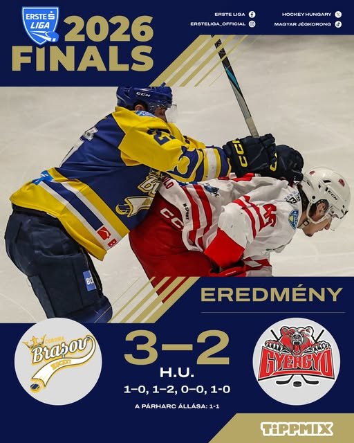 Corona Brașov a egalat situația în finala Erste Liga la hochei pe gheață, după ce a învins-o pe ACSH Gheorgheni cu scorul de 3-2 (1-0, 1-2, 0-0, 1-0), după prelungiri, vineri seara, pe Patinoarul Olimpic din Brașov.