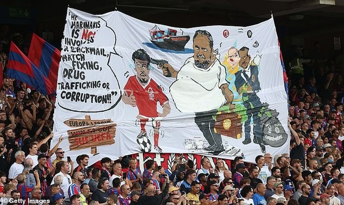 Dacă, pe teren, Palace și Forest au dat-o „la pace”, 1-1, în tribune n-a fost deloc așa. Suporterii amfitrionilor au afișat un banner în care patronul lui Nottingham, Evangelos Marinakis, ține o armă la capul mijlocașului său, Morgan Gibbs-White.