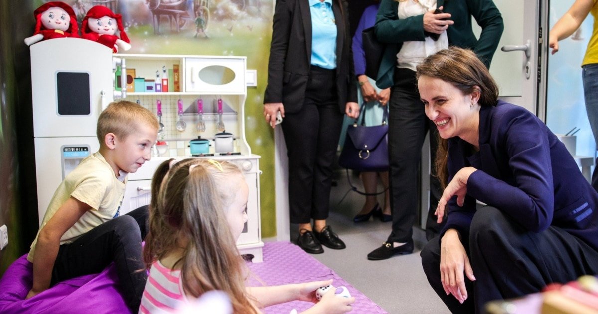 Ea a vizitat și Școala Supereroilor, care funcționează pe lângă Institutul Național al Cancerului, unde copiii bolnavi de cancer își continuă studiile în timp ce urmează tratamente extrem de dificile și dureroase cu ajutorul fundației patronate de prima doamnă, Olena Zelenska, cu sprijinul partenerilor internaționali.